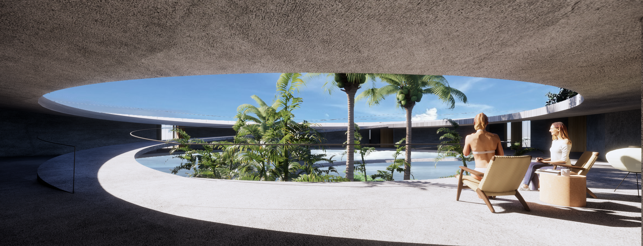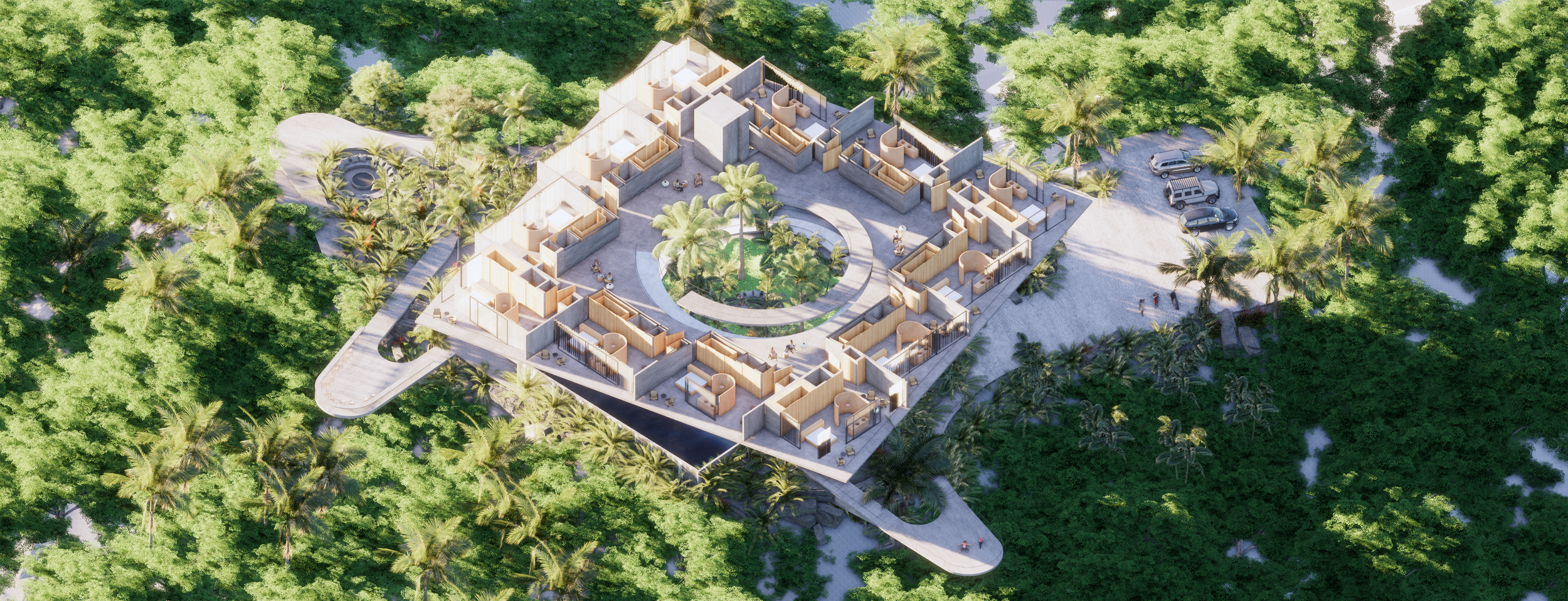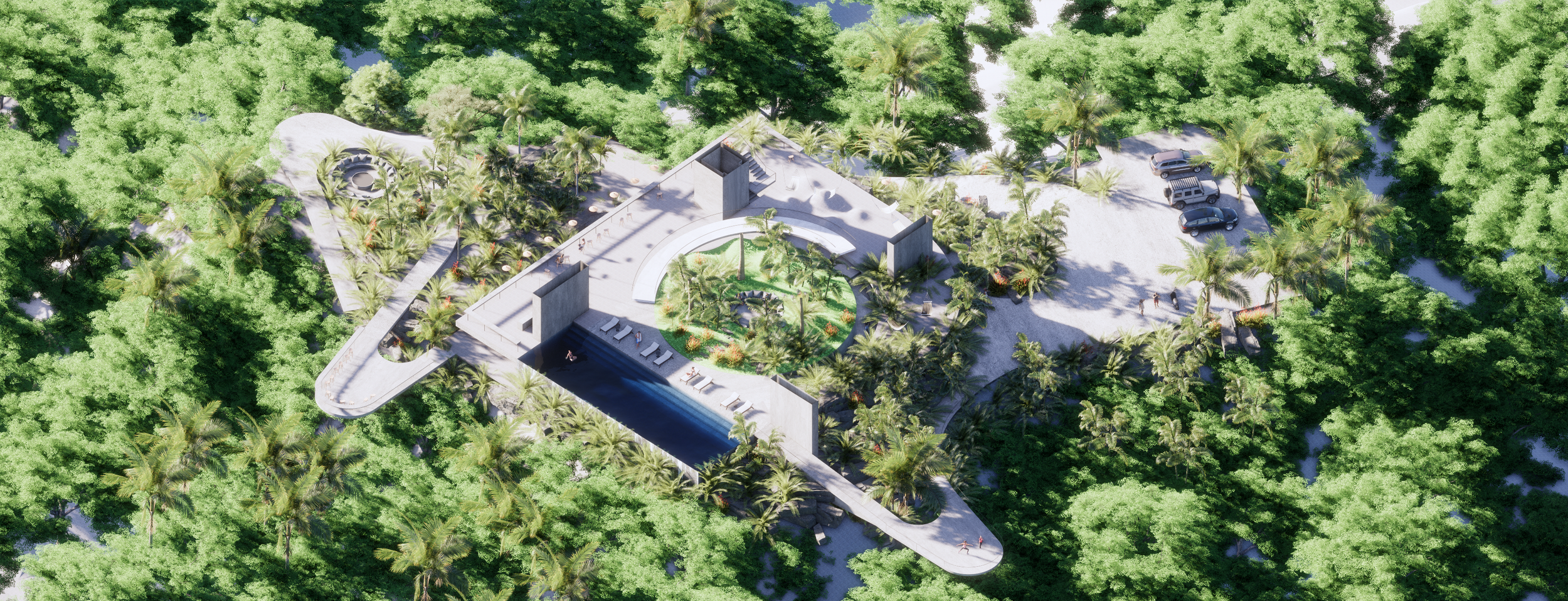 At its core, it is a single, calm yet assertive gesture—a floating roof that gathers beneath it a constellation of experiences. The broad horizontal plane holds the living suites, while below, the terrain flows uninterrupted, allowing the landscape to breathe through the structure. Architecture and land dissolve into one another, shaping spaces that are at once protected and open, intimate and expansive.