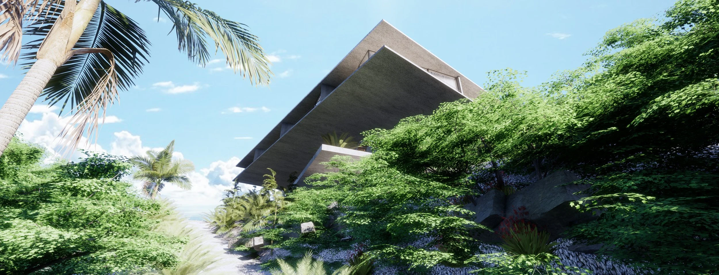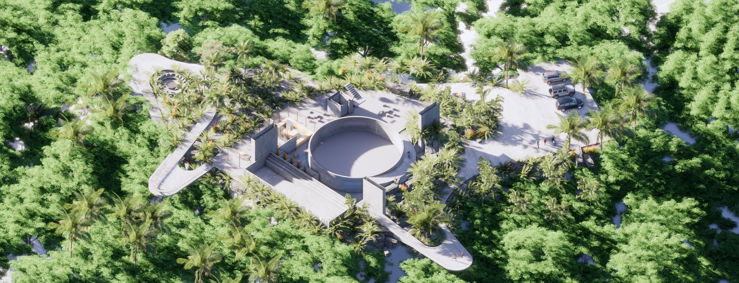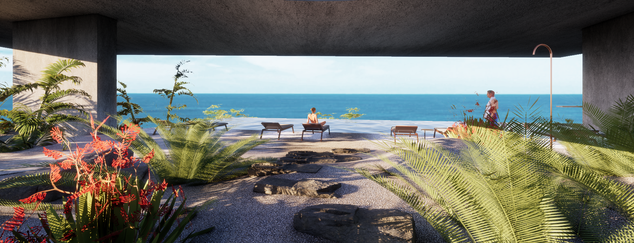 At its core, it is a single, calm yet assertive gesture—a floating roof that gathers beneath it a constellation of experiences. The broad horizontal plane holds the living suites, while below, the terrain flows uninterrupted, allowing the landscape to breathe through the structure. Architecture and land dissolve into one another, shaping spaces that are at once protected and open, intimate and expansive.