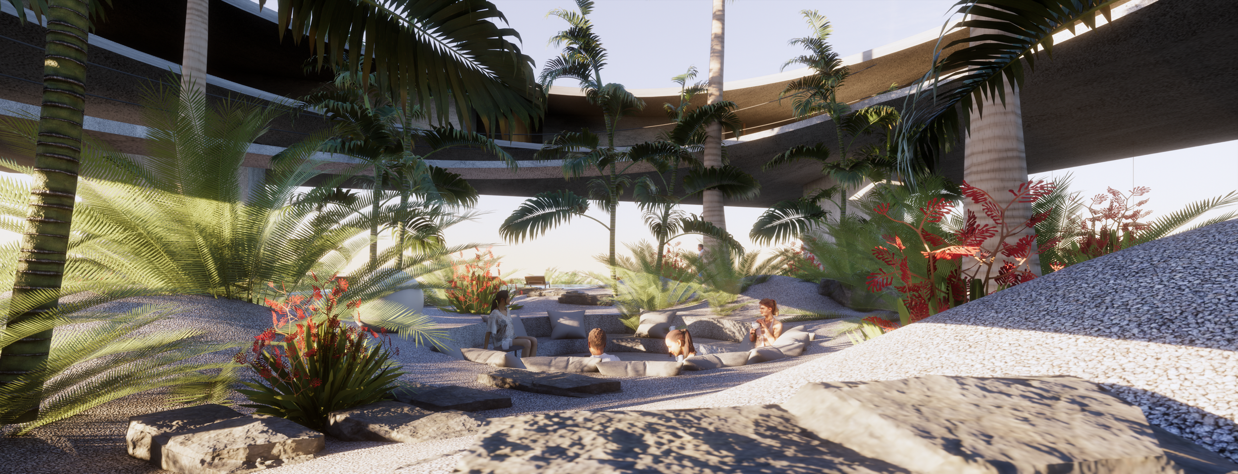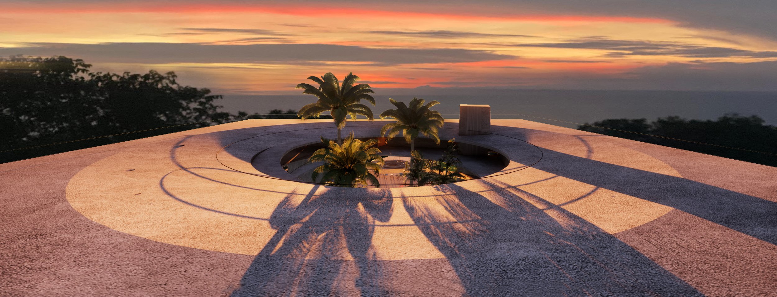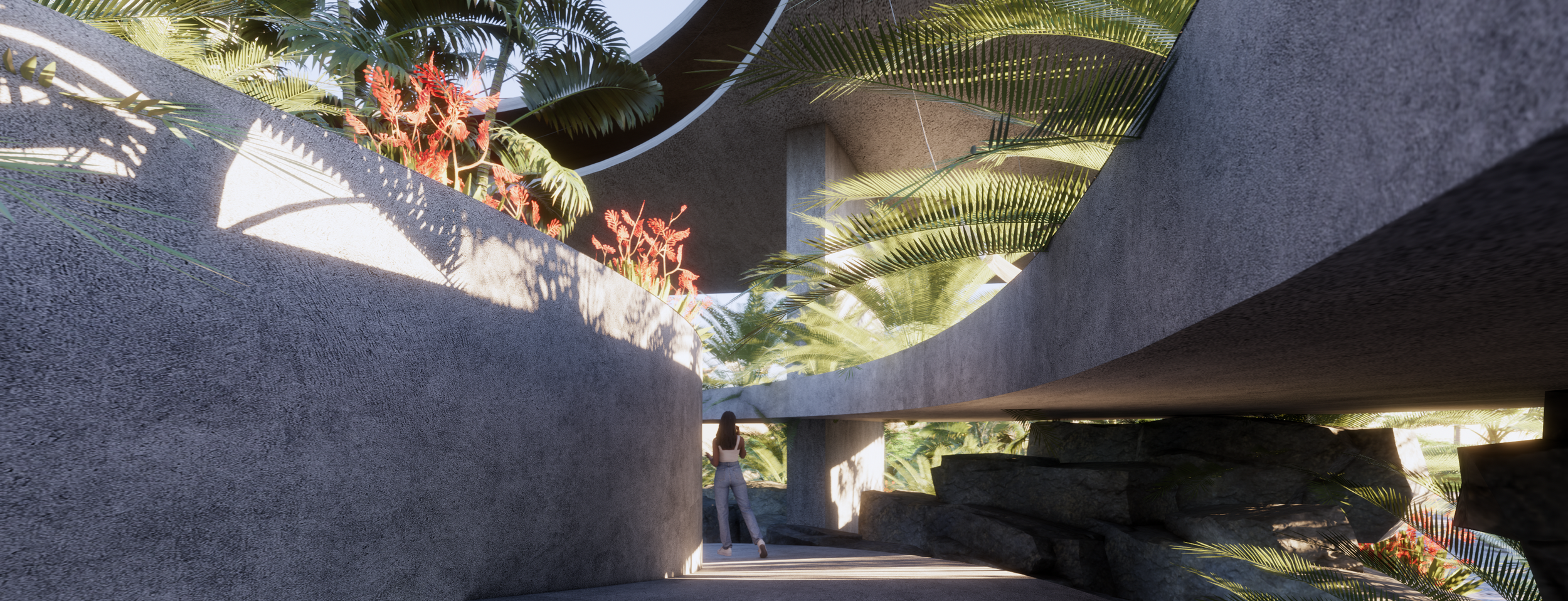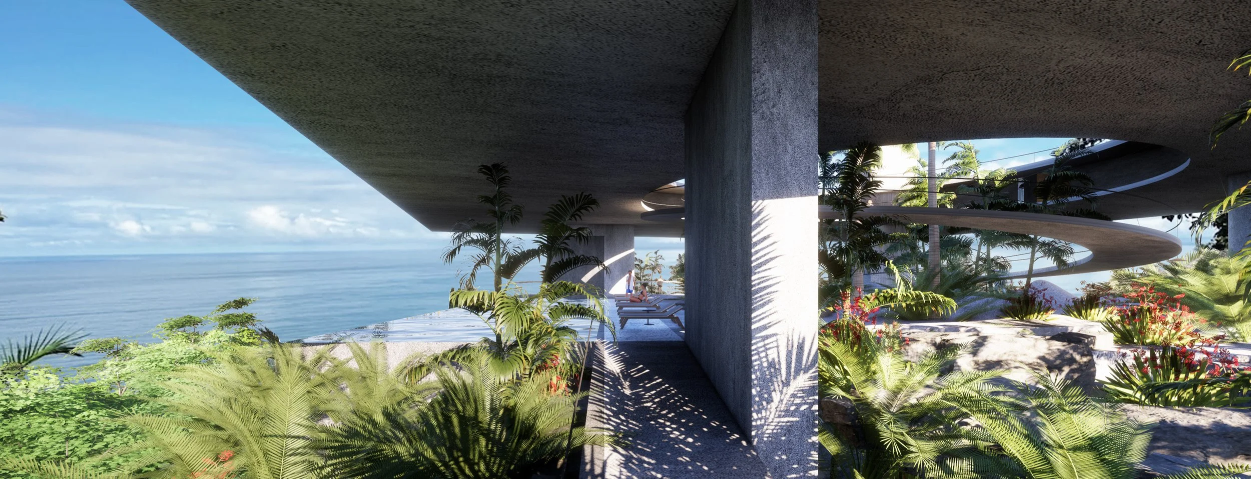 A pure square plan, centered around a circular garden, anchors the composition. This geometry—rational yet open—frames 360° views toward ocean and valley, embracing the landscape’s inherent duality. A spiraling ramp weaves between levels, choreographing a continuous experience through air, light, and vegetation.